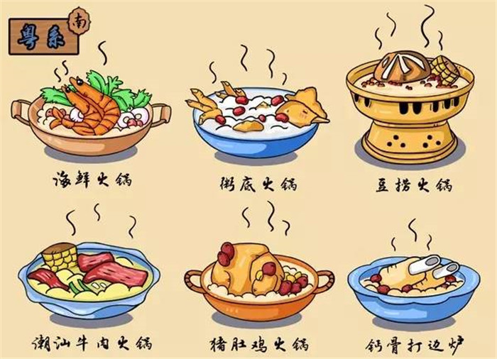 粤系火锅包括:海鲜火锅,粥底火锅,豆捞火锅,潮汕牛肉火锅,猪肚鸡火锅,钙骨火锅等。广东饮食讲究原味,最高境界的调味,是更能烘托食材本身的鲜美,而非喧宾夺主。